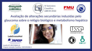 A aluna Eliz Oliveira Furtado, bolsista FAPESP, recebeu menção honrosa pela apresentação oral dos resultados de sua Iniciação Cientifica no IV Seminário Científico da Liga de Biologia Celular e Molecular da FMU. A aluna desenvolve projeto de pesquisa que busca compreender o papel da proteína GPNMB, envolvida na fisiopatologia do glaucoma, no controle molecular do relógio biológico e na regulação do metabolismo hepático.